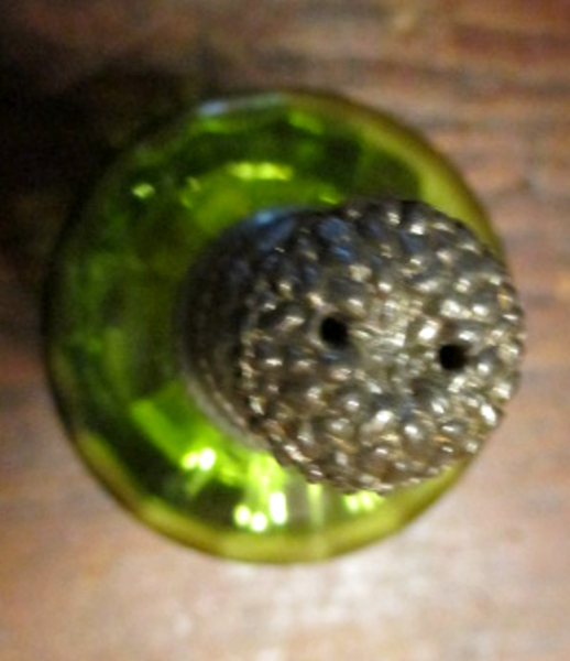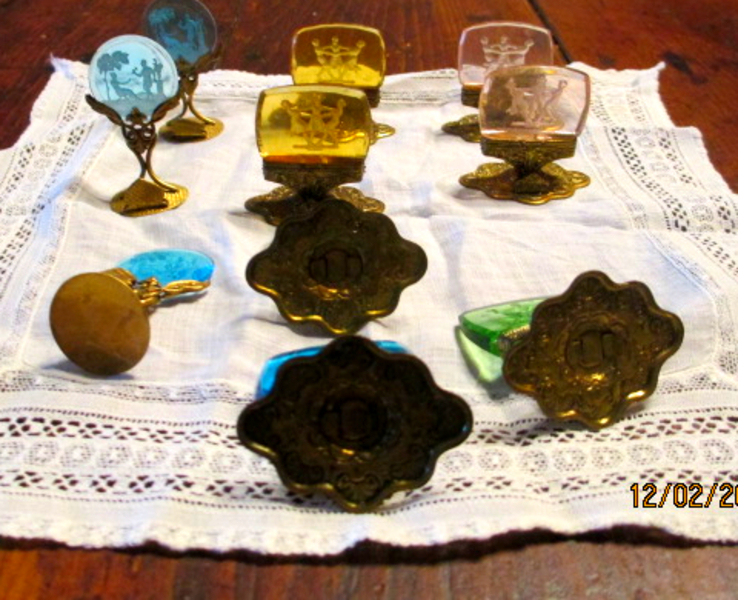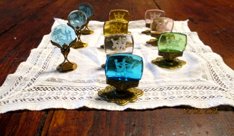Set that was Czech made in the 1920's. Measures about 1 1/2" tall. No issues. Reminds me of the Mary Gregory designs.Multi colored.