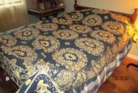 Large, 86" w x 94" long.Wool and Cotton with cotton batting.Very colorful with cotton patched back.Signed on the back in a corner, "AMO".Either Ohio or Indiana.Clean with a few tiny areas of separation in the red portions.Heavy quilt.A few brown stains on the back.More pics on request.