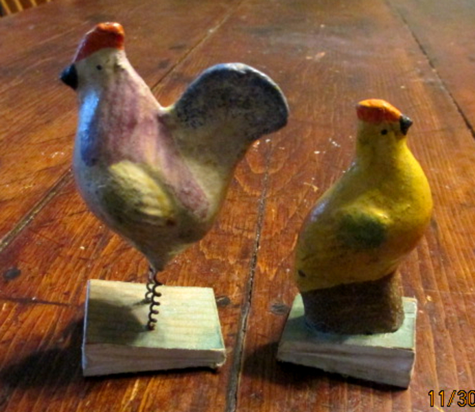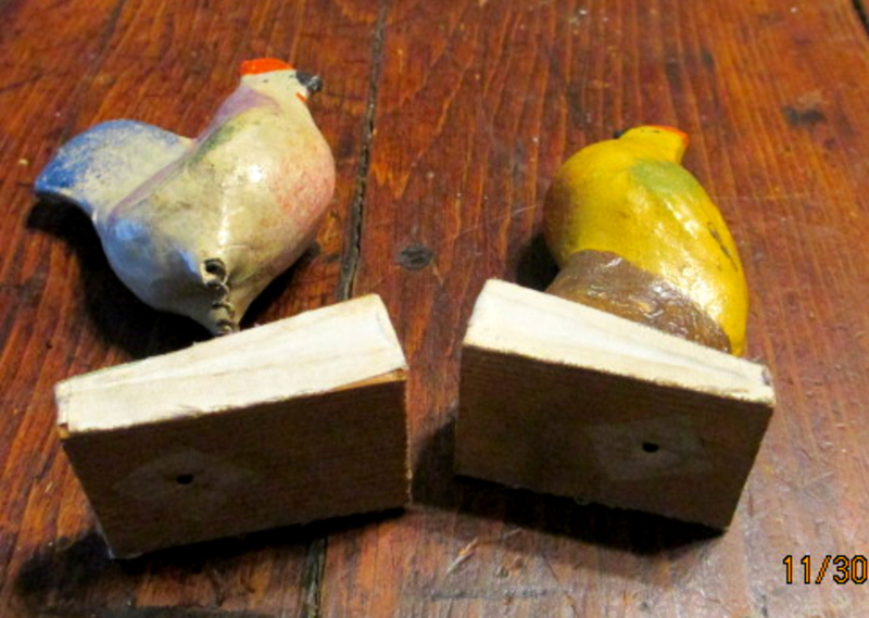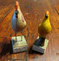 The rooster is 5 1/2 " high with a tiny crack on his red comb. The hen or yellow cardinal is 4 1/2" high, with a very tiny rib on her head. Bellows are clean, but no sound.