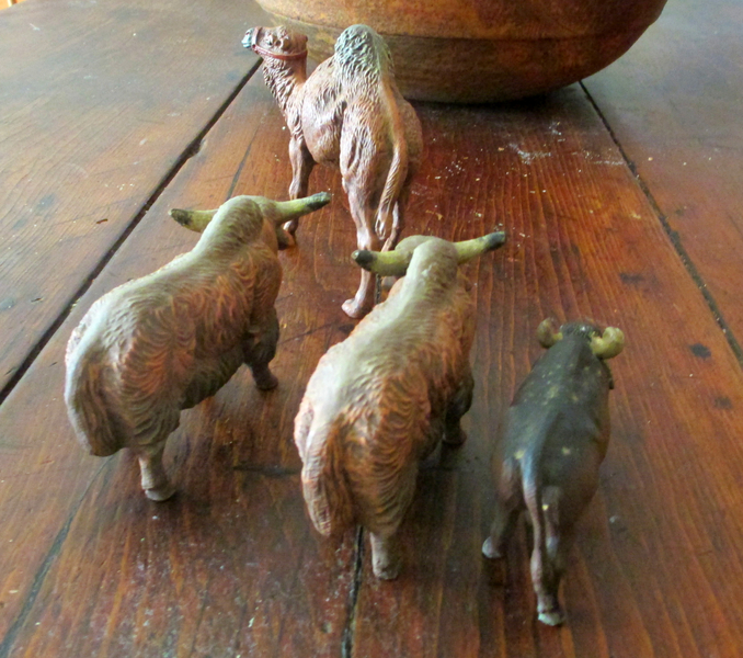 Nicely detailed and heavy.The small bull is marked Germany.The 2 Highland Cattle are marked but it is illegible.The camel is unmarked.The only issue is a repaired? crack on the small bull's tail.The camel is 5" high and 5 " wide.The Highlanders are 5 1/4" long and 2 1/4" high. the small bull is 4 1/2" wide and 2" high.Will consider selling them separately.Elastolin , a mixture of glue, sawdust, and clay was used to also make toy soldiers.Hausser is the German company.