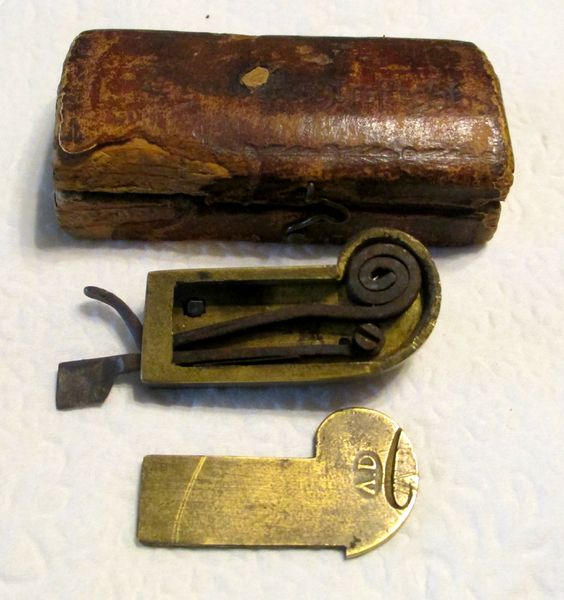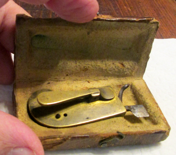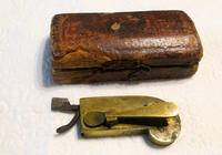 Measures a total of 2 1/2 " wide by 1" high.Measurements include the cased Fleam. Used by doctors for humans and horses to open a vein to release a certain amount of humors.Condition is excellent, working and includes the rare collection spoon and original leather case, embossed with the translation from German, " don't trust the..." Here is a video that explains this device. https://www.google.com/search?q=1860%27s+brass+spring+loaded+fleam&sca_esv=48c2a6a335f0c113&rlz=1CAVARX_enUS1082US1082&sxsrf=AE3TifNlDQLZhDwI6uX1gz98MYAHnhwBLw:1757363579345&ei=ez2_aIbmFJuV5OMPsqHYsQI&start=10&sa=N&sstk=Ac65TH588HUrP1-YnYuWTabcxa-UicFtRdMPZmaAecpZKcd_vl0_Ede15MFmyo13wi2kNBSYZg4pAlUxX60z4rjcpDuYuh0T3_0low&ved=2ahUKEwjGj42_gcqPAxWbCnkGHbIQNiYQ8NMDegQIDBAW&biw=1920&bih=959&dpr=1#fpstate=ive&vld=cid:f8d444b3,vid:oxSkMbtBMT4,st:0