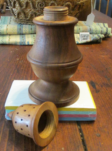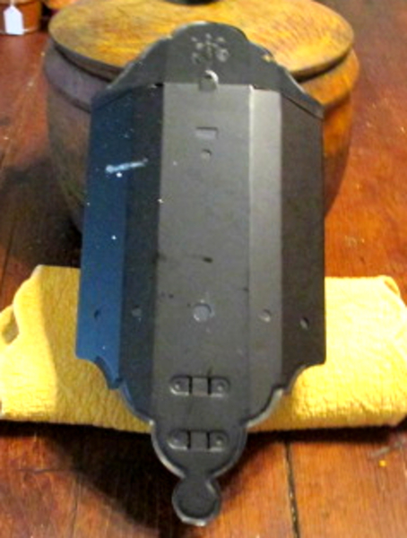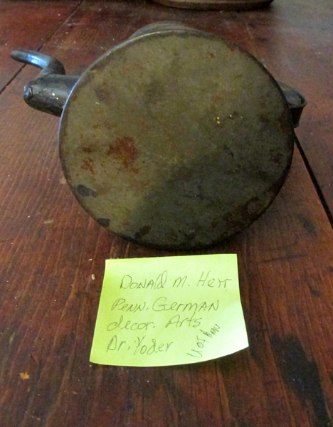 Measures approx 10" tall. Attributed to the Mahantongo Valley, Penna. area.The paint is still very exuberant with wear.There are no holes.The finial is a little crooked as I was unable to get the wingnut loose enough to move it to the top.There is some interior rust and flaking of the black paint inside the lid and the pot.A yellow sticky was at the bottom of the pot that reads, "Donald M Herr, Penn German, Decor Arts, Dr. Yoder, Univ of Penn.Overall in good condition.