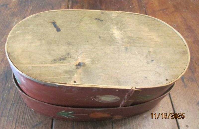 Measures about 7 1/2 " long, with copper tacks and pegs. Does have a dark brown stained / painted strip around the rim.I have not seen that before.No lid.Maple bentwood with pine bottom.No issues.