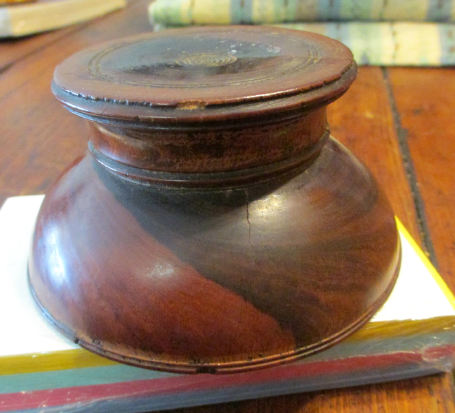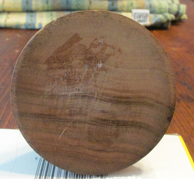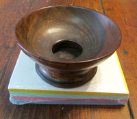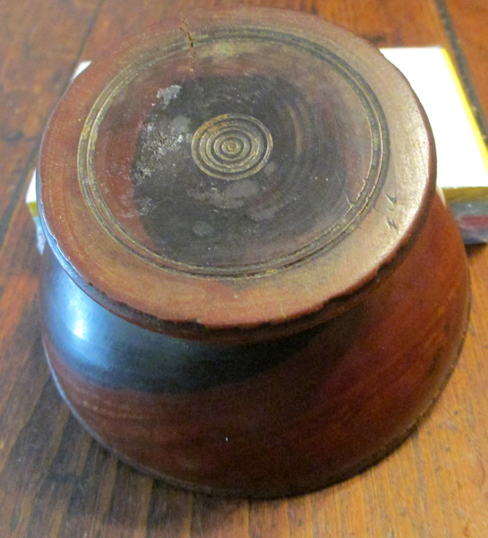Measures 4 1/4" wide and 1 1/4" high. Beautiful dark and light grain.There is a middle well that might have held a pedestal for a nutcracker.Two small hairline cracks,pictured.Very smooth and refined.