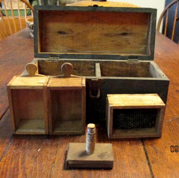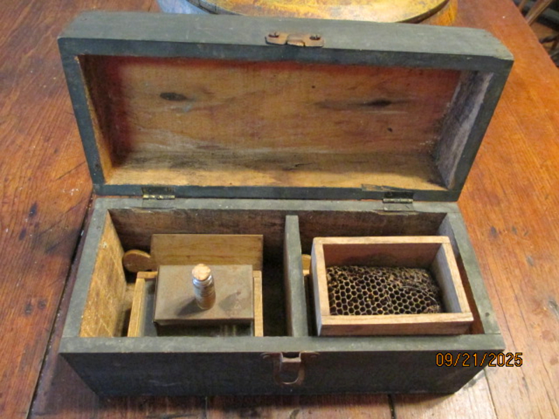 Measures 12" x 5" x 6 1/4. Includes 2 slide lid boxes with glass panes and an open box with a honeycomb for the queen to feed on.A bottle of Anise Oil to attract the other bees so that they will follow that fragrance back to the new hive and a tin box to pour the oil into.The only issue is that the leather carrying strap on top has part of the handle missing, but the strap is still firmly attached to the box.