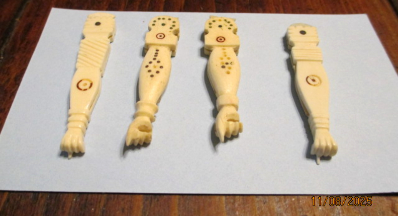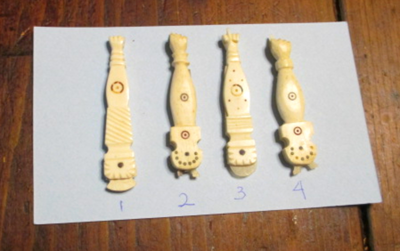 All are about 2" long and decorated with designs enhanced with black or red ink. Usually sailor made. These tools were used.Each one is being sold separately. All are in great shape with areas of wear. Probably English.