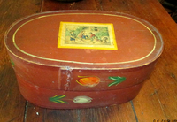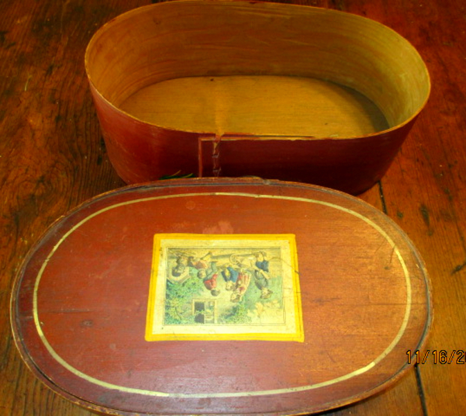 Measures 15" long and 6 " high. Paint is a lovely berry red with the Victorian label of children playing. All original paint and condition.The lid does show a bit of separation from the rim and the pegs are missing from the bottom.I can insert some stained wooden toothpicks if desired.Lovely Christmas gift box for a special gift to a loved one.