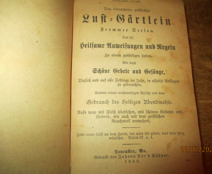 Small 6" x 4" Hymnal written in German and published in Lancaster, Pa. The book is fragile and a beginning page is beginning to loosen from the spine. It is from the Sadie Eash estate. I bought it there with other family items in Bird In Hand/ Intercourse , Pa from the Horst auctions. The hymnal shows the Eash initials in a still vibrant pink and blue design.The leather book is missing its side clasp.