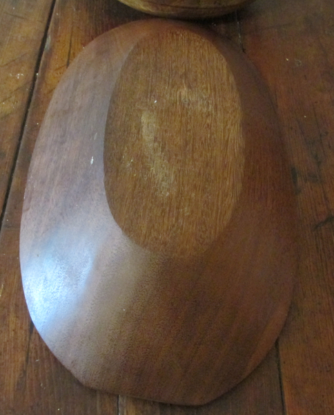 Measures 21-1/2" L X 12 -1/2" W X 4 " high.Heavy ,solid walnut.There is some picture glare and a tiny amount of fading. Excellent condition as these bowls were decorative and not utilitarian.A beautiful walnut grain.The bottom of the trencher is showing glare not fade.