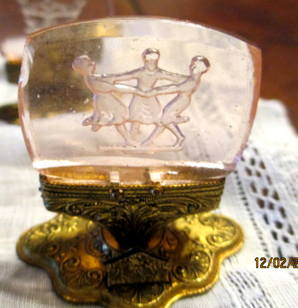 Measures 3" long not including the tassels.Bottle has an elongated glass stopper.Painted mint green with Asian scenes.No issues. 1920-1930