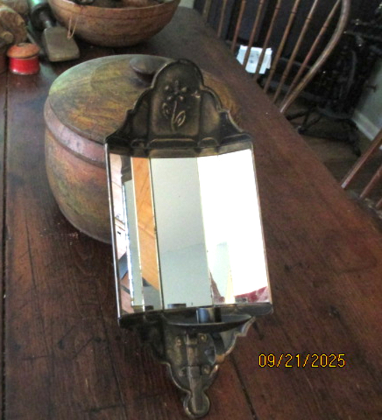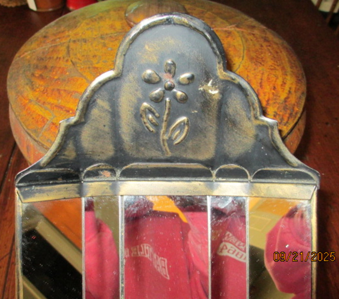 Measures 17" long and 7 1/4" wide, approx. Deco style but of the 1960-1970's. An impressed flower at the top. Heavy, possibly painted brass. Corner sconce. There are a few paint speckles on the back, and some wear to the top front.Because the mirror is so fragile , extra packing and a larger box will be required.