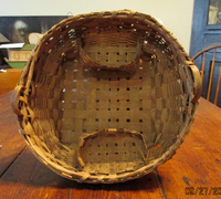 Measures 6" high and 5" wide on the base.If you just needed some eggs for dinner, this would have been the home made basket that you would have picked.Beautifully woven with a piece of bottom splint gone.The rich patina is from the 1930's.A scarce basket to find.Notice the larger base for stability, so that you would have not lost your eggs.
