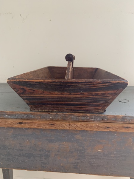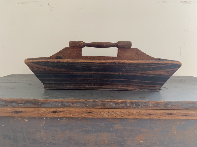 19th C. Original black grain painted carrier constructed of pine. The handle is applied and it is made using tiny cut nails It measures 12 3/4 inches w by 8 1/4 inches deep by 4 1/2 inches to top of handle.