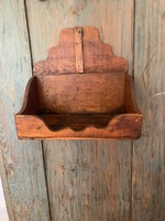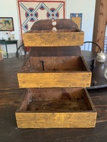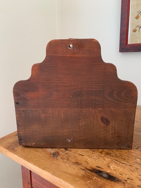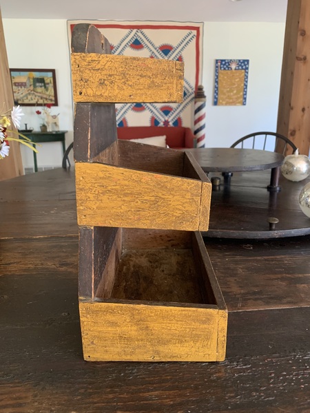 This 3 tiered wall box measures 16 inches tall by 12 inches wide by 7 inches deep. It still retains some stained areas and traces of mustard paint. There is old original hole used for hanging has worn through and another hole has replaced it.