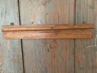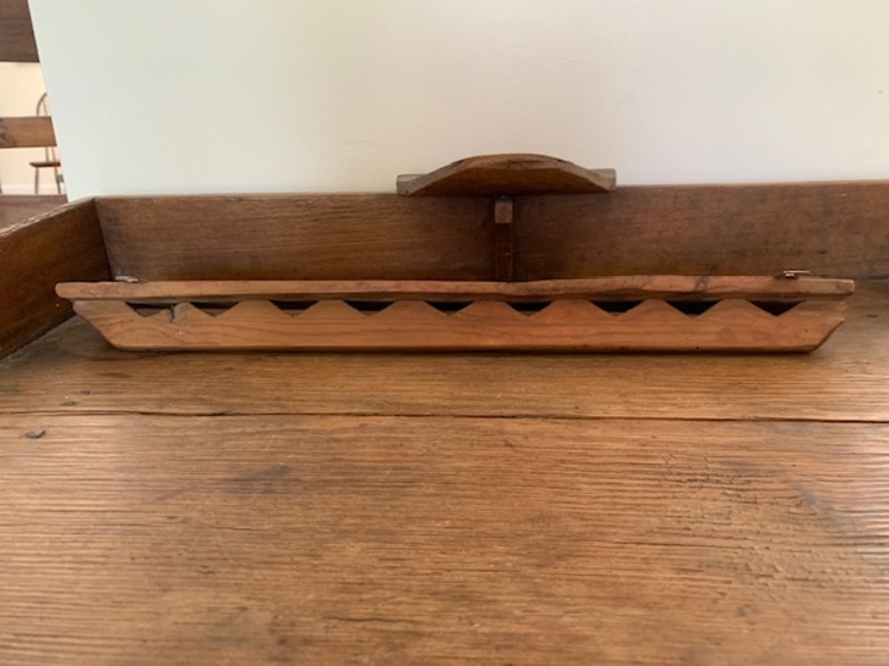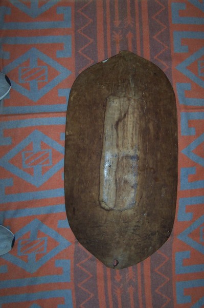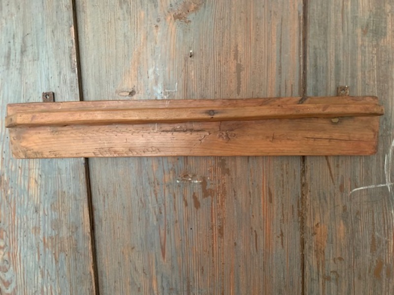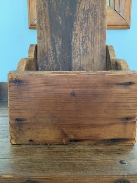 I say well loved and used because the bowl of the trencher is as smooth as glass. There were handles but have been lost over the years of use and there is a hole for hanging it out of the way. I've noticed one tiny crack that has been secured with a square-head nail, hardly noticeable. This trencher measures 26 inches long by 13 1/2 inches wide by 3 1/2 inches high. Such a neat primitive.