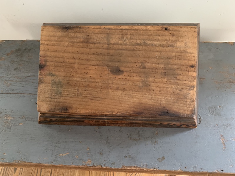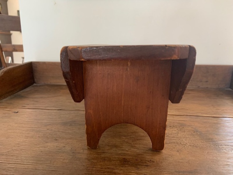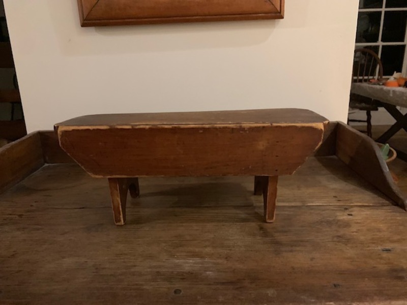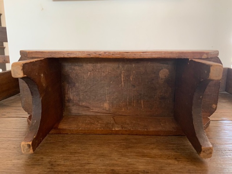 This New England foot stool measures 12 inches wide by 8 1/2 inches deep by 4 3/4 inches tall. The original dark brown paint is worn in all the right places. There is an opening at the top for carry. It is constructed with canted sides and. tiny cut nails.