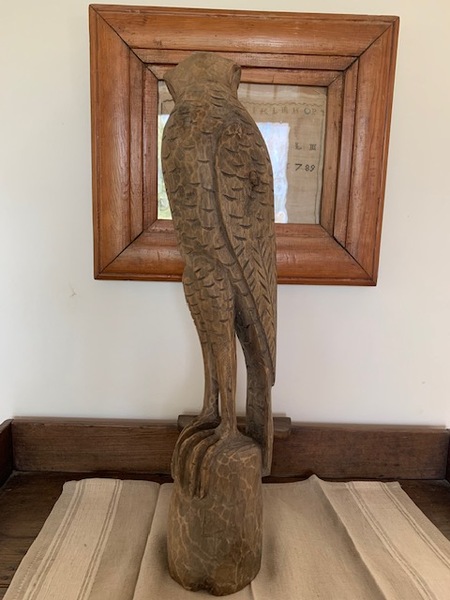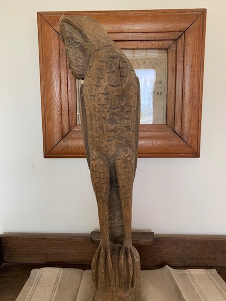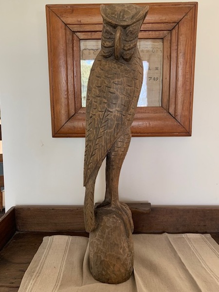 Folksy owl carved from one piece of wood. (species unknown). 22 1/2" Tall Widest point of the body is 5".