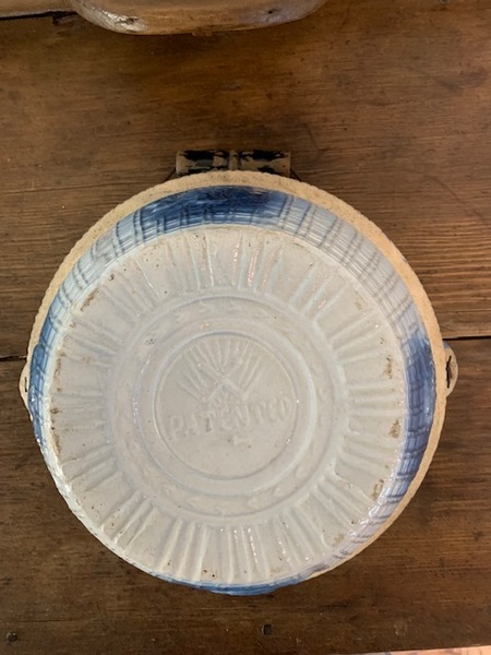 This early 1900s blue and white stoneware bowl with a bail handle has a diameter slightly over 10 inches and is 5 inches tall. The bail handle has a grip that shows worn black paint. This lovely bowl has an all over lattice design with four daisy flowers. The patented mark is on the bottom as shown.