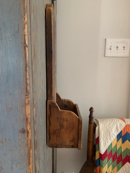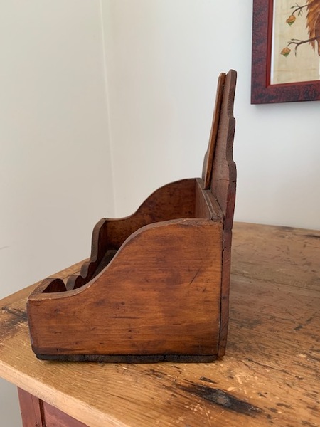 This varnished salt box dates to the late 1800 - early 1900. The maker took great care in the construction to create a piece that looks like a buffet. The one drawer at top and the two below are carved into the box and the pulls are small pegs. The top is not hinged. On the side panels there remains the grain painting using the combing technique. It measures 51/4 inches to the top of the scalloped back splash, 3 inches deep and 6 inches wide. Tiny nails were used throughout construction. This piece is very well made and in pristine condition.