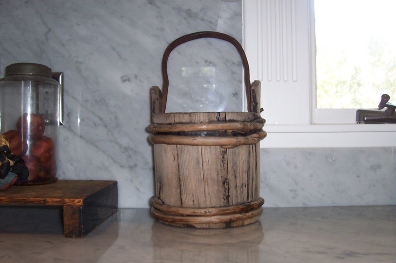 Neat bucket with a hand wrought swing handle. It measures 16 inches high to the top of the handle and 8 inches high to the rim with a diameter of 8 1/2 X 8 inches . It's in very good condition with the staves fairly tight and the branches wrapped securely around the body of bucket. I've noticed a faint smell of pine tar.