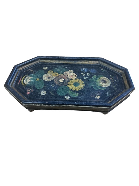 Early painted footed tray. Wonderful paint history on black with soft gold trim. 12” x 7”