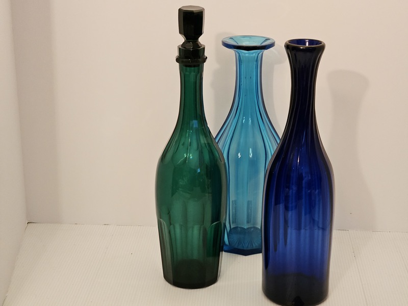 Only the Aqua is left...the others have sold/ Choice of Early blown and simple molded glass examples ...choice $485 Shipped in the continental U.S. Choose from a New England Turquoise Bar Bottle, Emerald Green Decanter, and Scottish Cobalt Wrythen Bar Bottle The Turquoise New England Bar Bottle and the Green Decanter are both from the collection of Peter Tillou. The Cobalt Blue Bar Bottle was from the collection of Bruce Knight. Shipping and insured handling are included in this price. in the continental US.