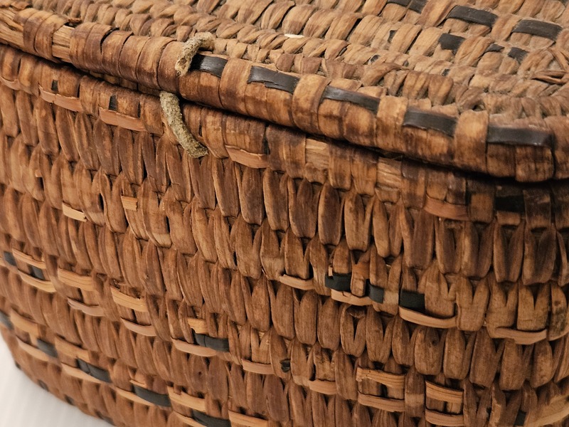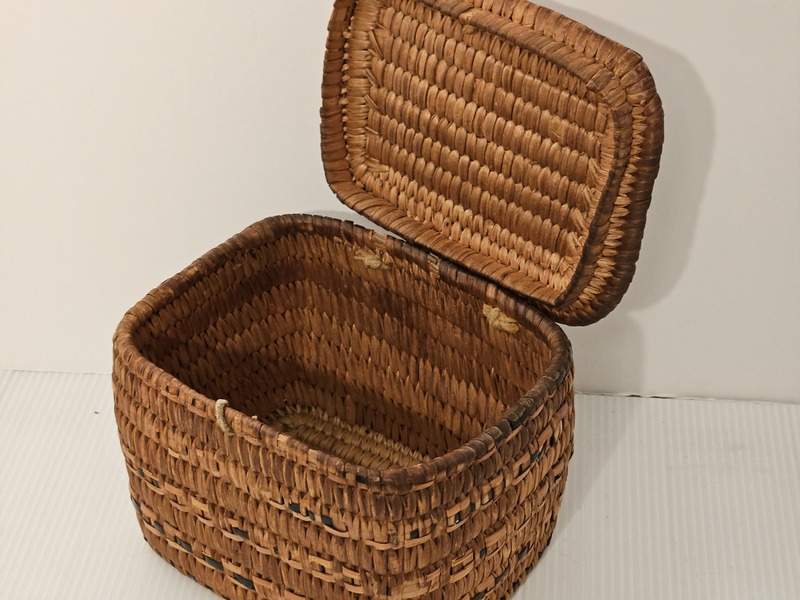 Native American Handwoven Lidded Basket. 5 inches by 4.75 inches. Probably 1880 's. The little basket has a fitted little lid with leather hinges attaching it to the base.The leather hinges and latch are worn. Shipping and insured handling are included in this price. in the continental US.