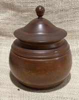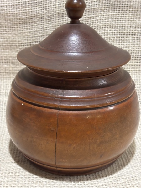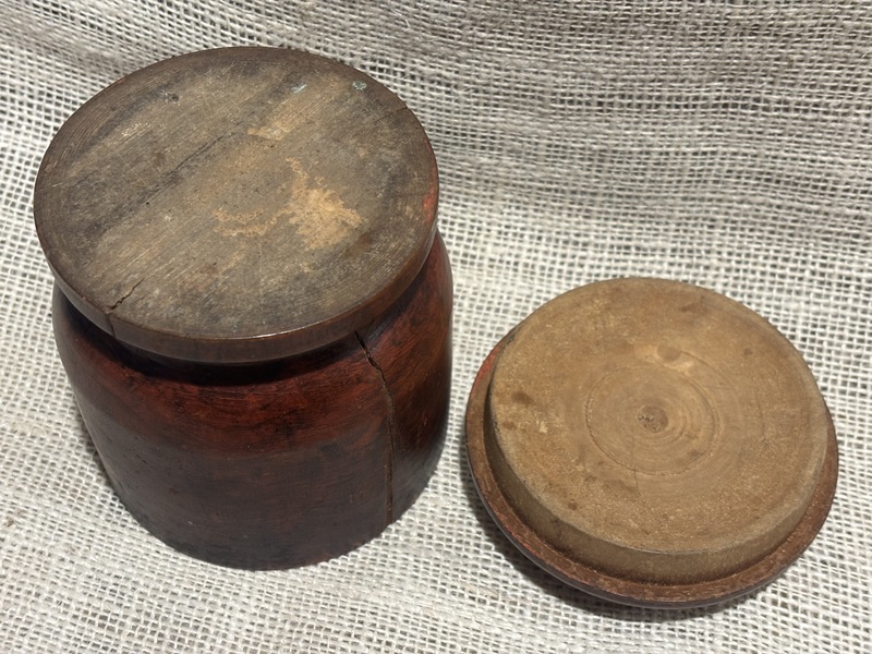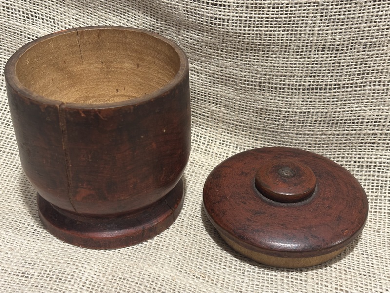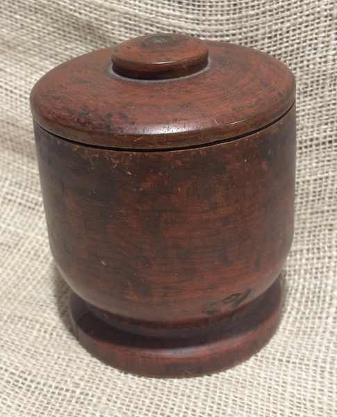 Early 19th century painted treenware covered jar. Nicely worn red paint. As seen in photos, shows age with shrinkage cracks, largest one with repair with filler on side, then another hairline on opposite side, and 2 small on edge of footed base. Remains stable and just a wonderful piece of early treen. Measures 5" tall, 3 3/4" diameter.