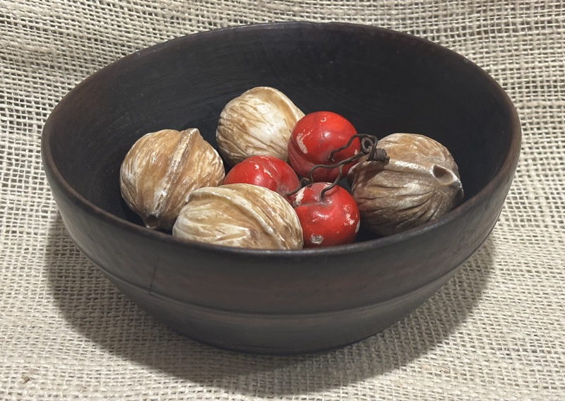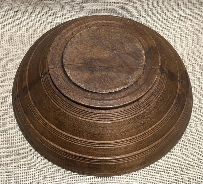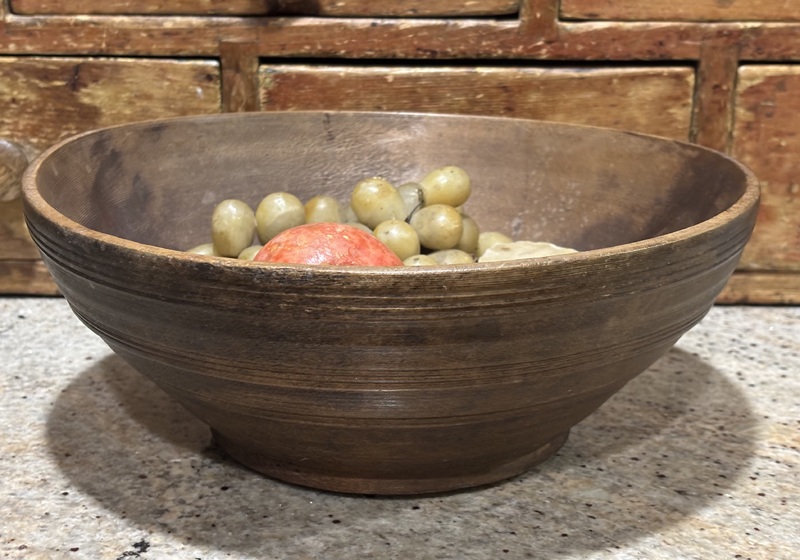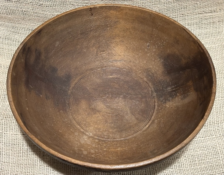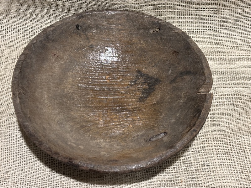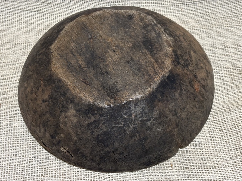 Nice 18th century treen bowl. Remnants of black paint, mixed with grunge. Wonderful wear that only comes from use and age. Great primitive look! Measures 9 1/2" diameter.
