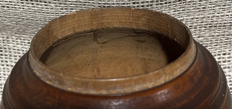 Wonderful early treen beehive bowl. Great dark patina with wonderful turnings. Footed base, great for table centerpiece. Has well done repairs as seen in photos-cracks on both sides but do not connect, 1 side is a little more than halfway up side, and on other side of bowl 2 cracks that start on rim. Still remains solid wonderful late 18th/early 19th century bowl! Measures 10 1/4"-10 5/8" out of round, 4 3/8" high.
