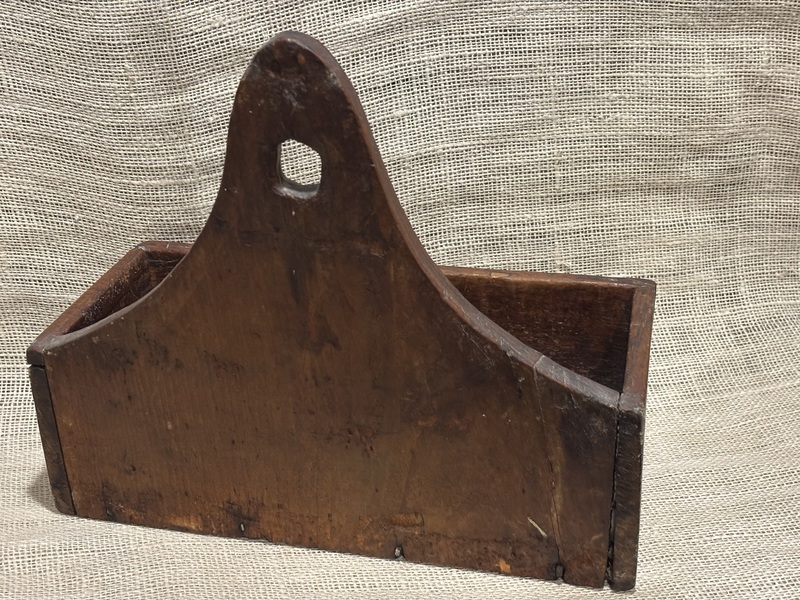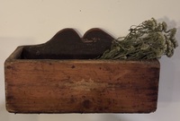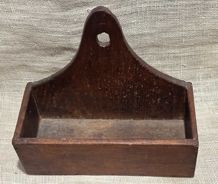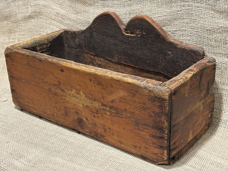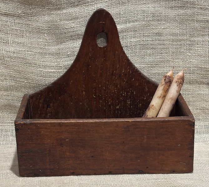 Wonderful 19th century New England painted candle wall box. Pine, shaped crest, with square nail construction. Great surface with red wash. A fine example of a New England wall box. Measures 11 1/4" high, 12 3/4" wide, 5 3/4" deep.