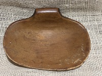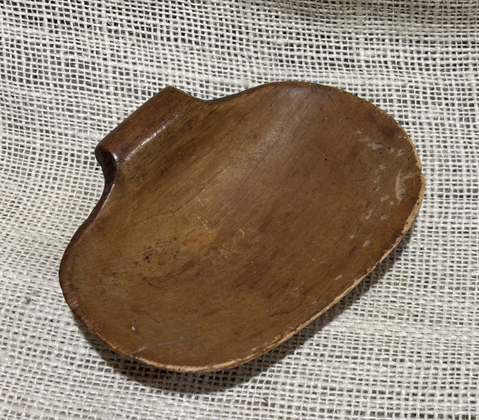 Nice early treen clamshell scoop. Nice patina, as seen in photos shows signs of wear. Measures 5 7/8" x 4 1/2".