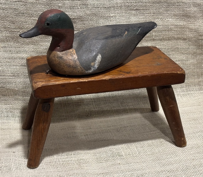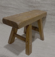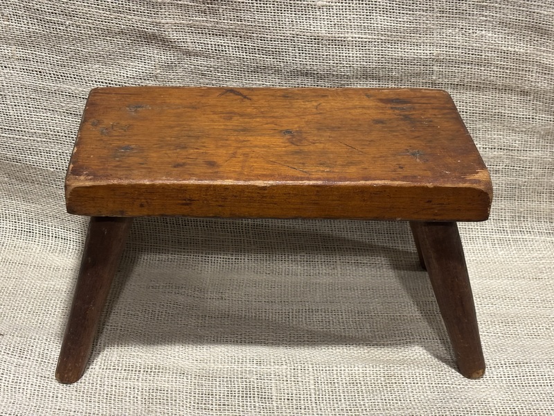Nice early footstool. Pumpkin colored stain with green paint underneath, Sturdy, good overall condition. Measures 11 1/2" wide, 6 7/8 inches high.