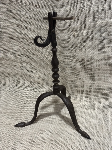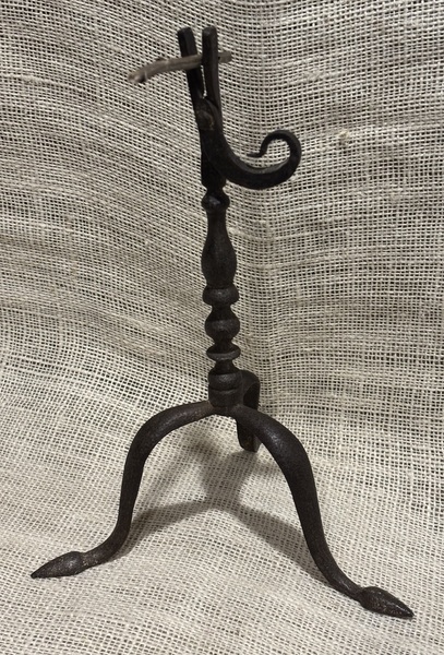 Rare 19th century iron rushlight. Wonderful, lathed turnings, tripod base with arrow feet. Short curled counterweight. Great surface, museum quality. Measures 10 3/4" high.