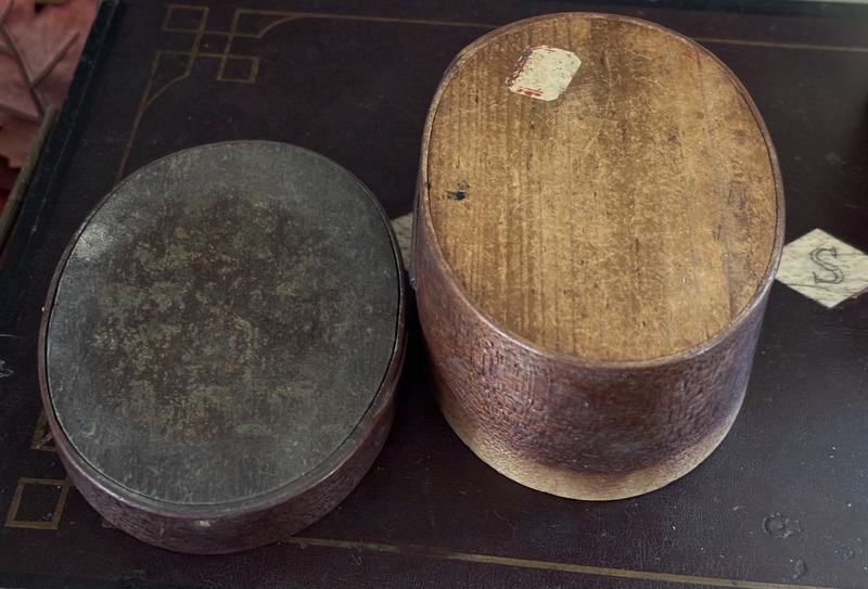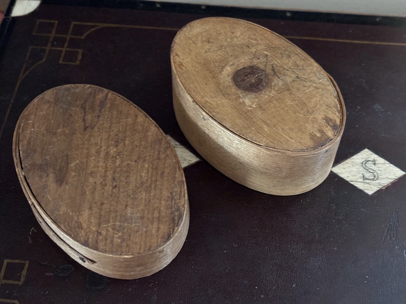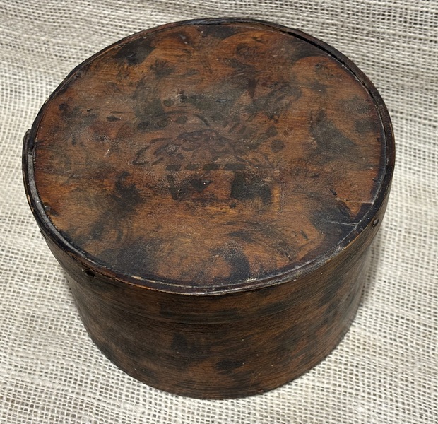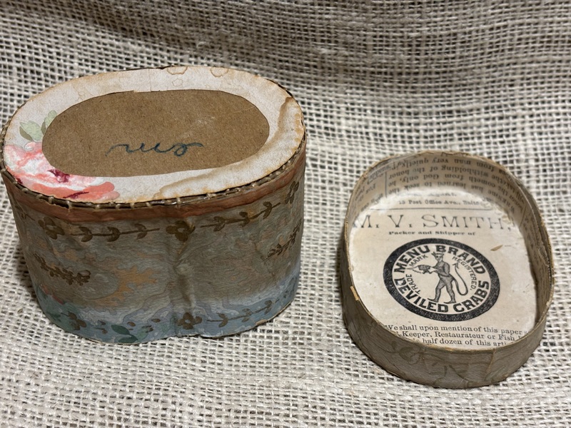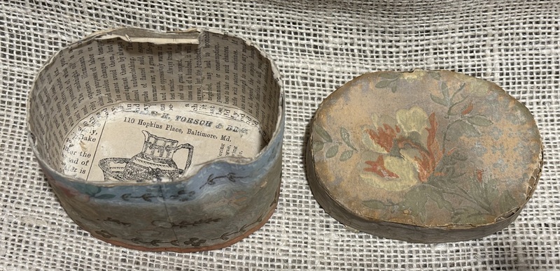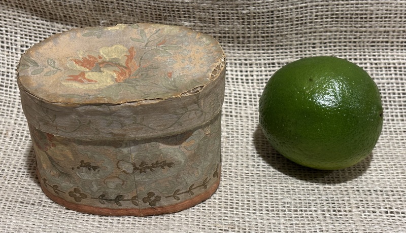 Sweet early miniature oval wallpaper box. Lined with early newsprint inside. As expected much fading of colors on wallpaper. Measures 3 7/8" x 2 7/8" x 2 3/4" high.