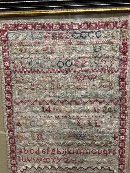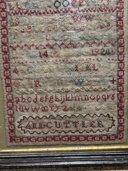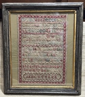 Nice c.1840 sampler. From Hudson Valley New York. Signed Ann Cuttler, design with border typical of samplers from 1830-1840. Retains pretty red/burgundy color. In overall good condition. Period frame. Measures 19”tall, 17 1/2” wide.