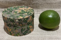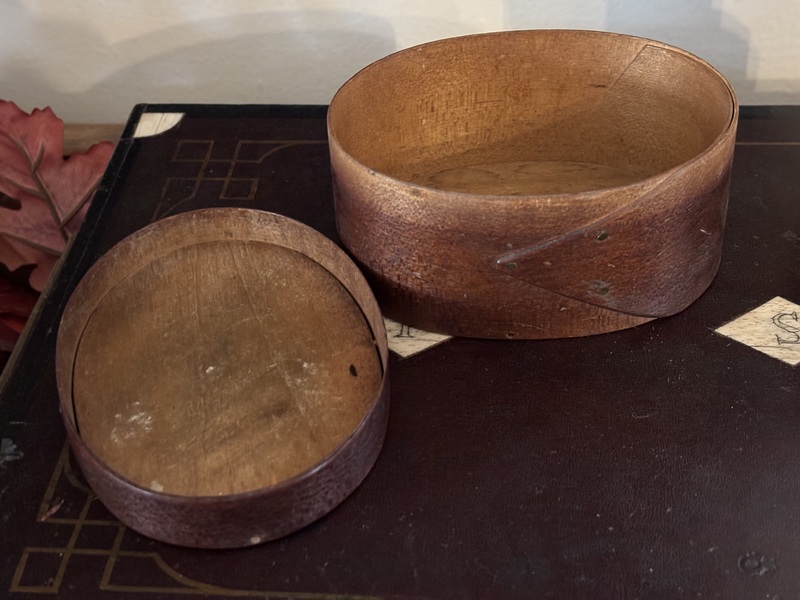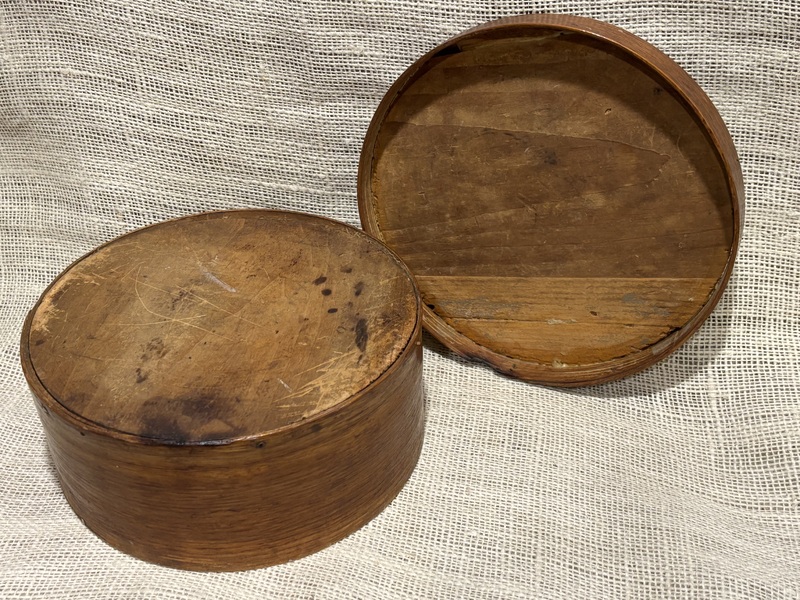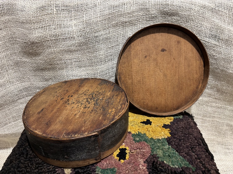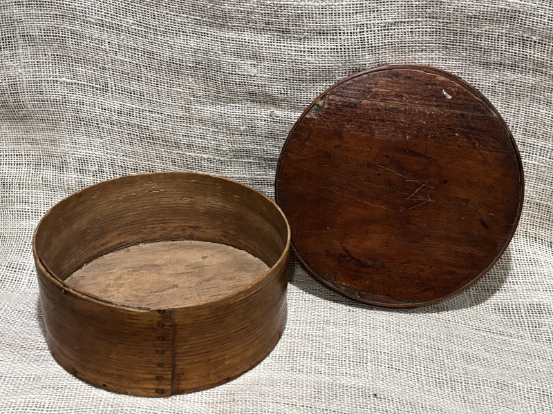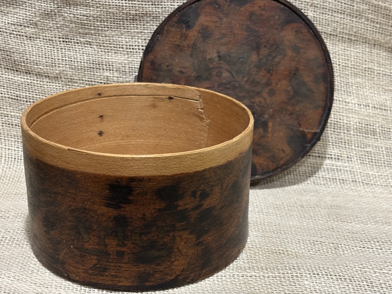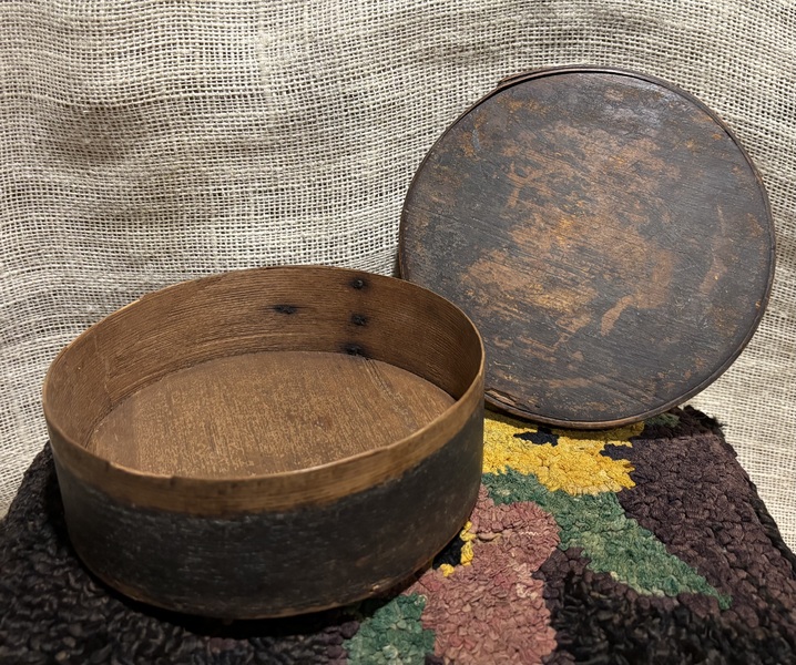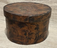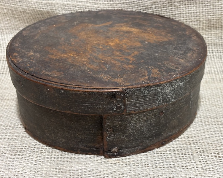 Early 7” Painted Pantry Box. New England,19th century. Dry dark green milk paint. Early tack and wooden peg construction. In overall good condition. Measures 7” diameter, 2 1/2” tall.