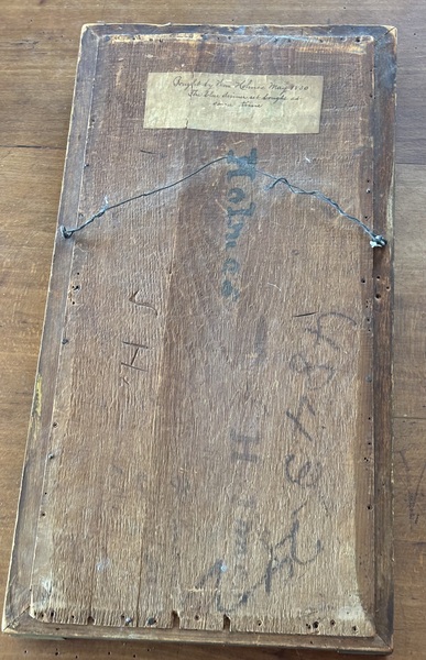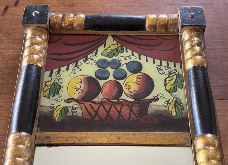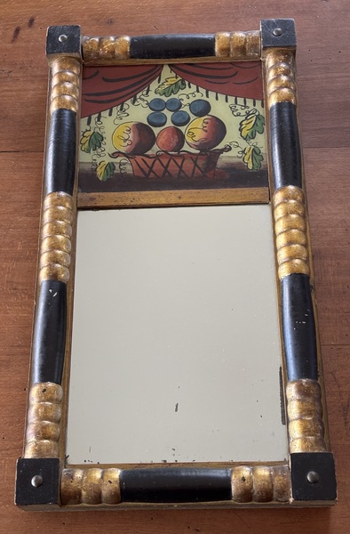 Wonderful Federal Period mirror. Original reverse painting inside original painted frame. Replaced mirror at some point. On back is note- “Bought by Wm Holmes May 1830 The blue dinner set bought at same time”. Also on back signed Holmes in early ink twice. Measures 20' tall, 10 1/2" wide.