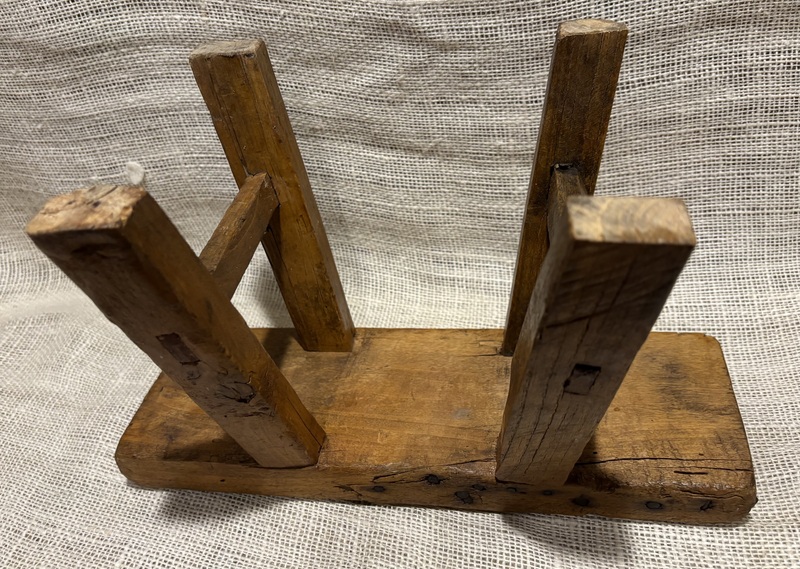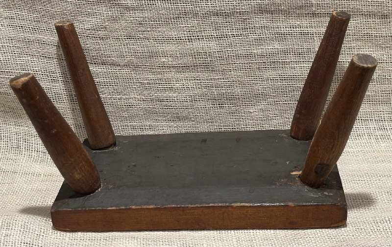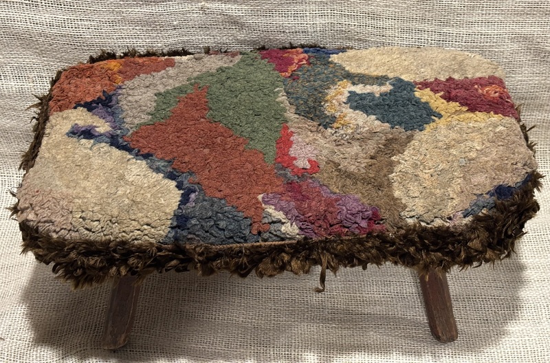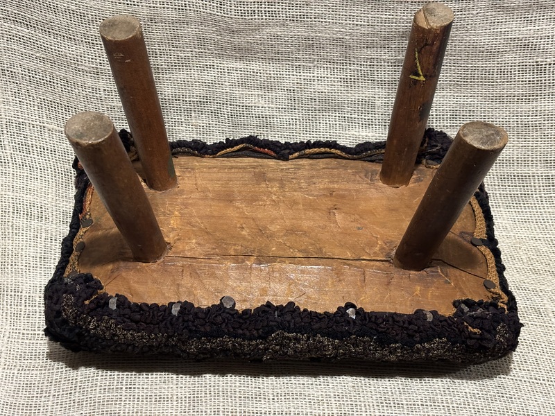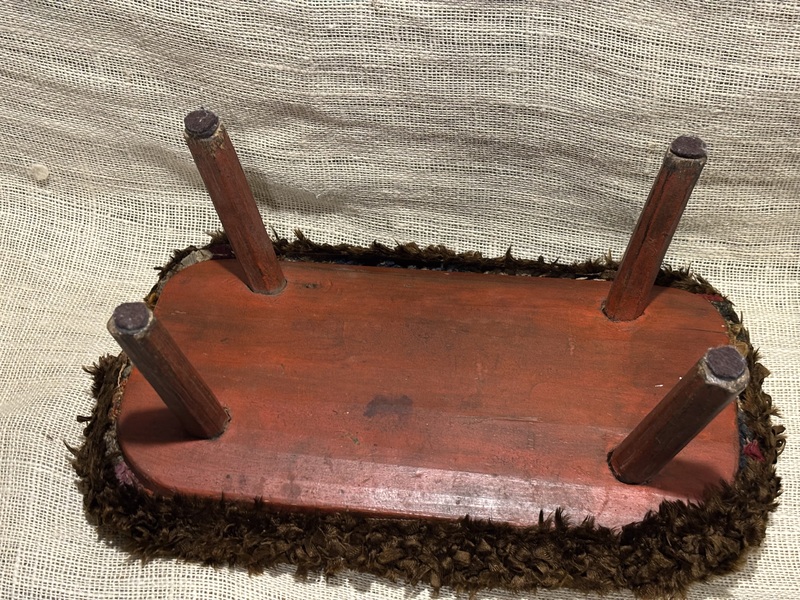 Sweet early footstool with hooked upholstered top. Primitive design. Measures 16 1/2” x 9 1/2", 7" high.
