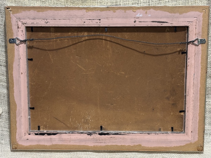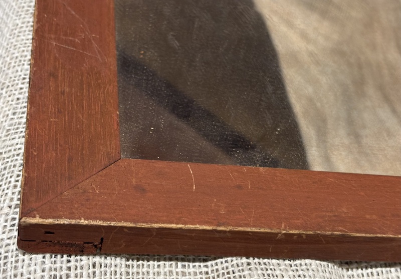 Wonderful early salmon painted mirror. New England, early 19th century. Beautiful original dry salmon painted surface. Period glass. Measures 9” x 11”.
