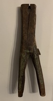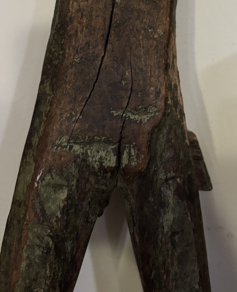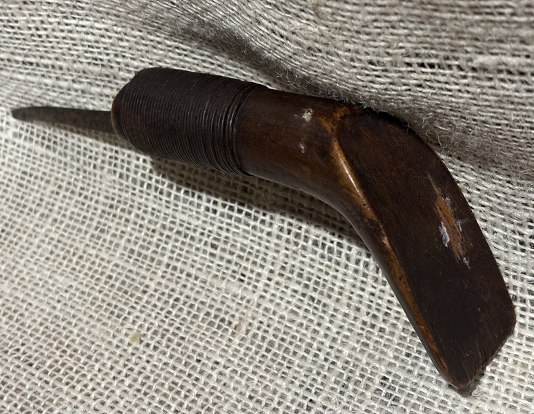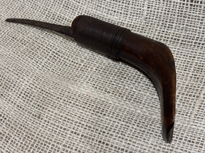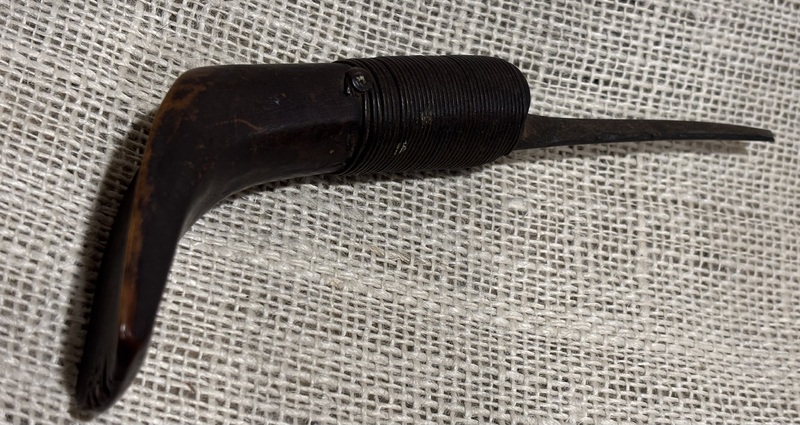 19th century crooked knife. Nice dark patina on handle with wire wrapped blade. Handle measures approximately 4 1/2", blade 2 7/8".