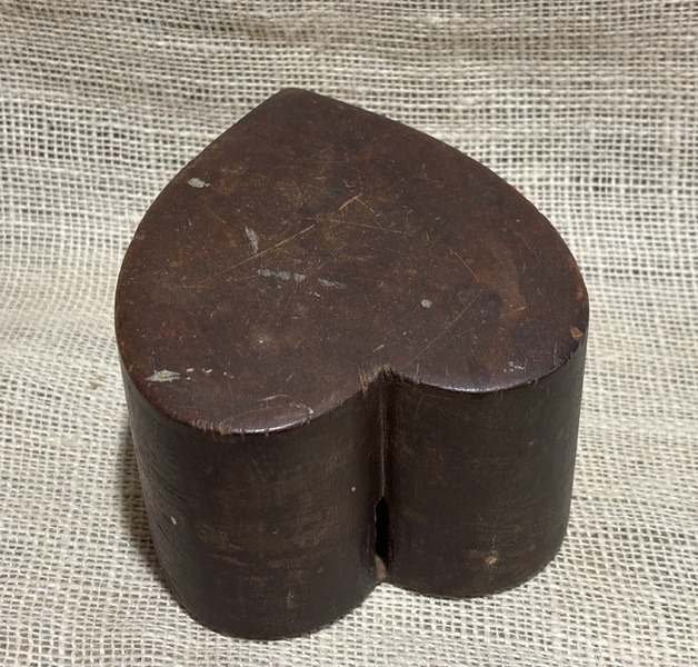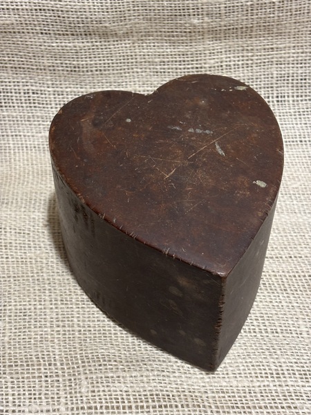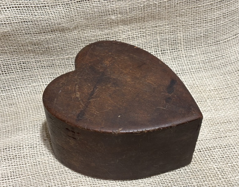 Wonderful early treen heart shaped bank. 19th century, pine, brown wash. Great dry surface. From Smitty Axtell Collection. Measures 6" long, 5" wide, 3 1/8" high.