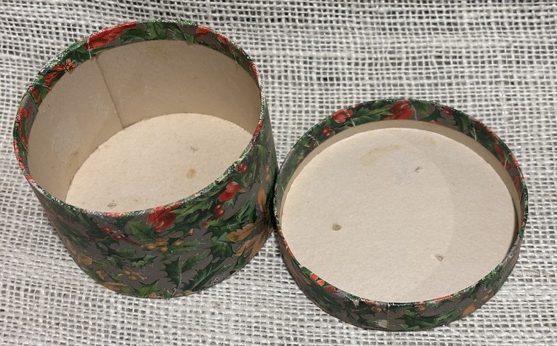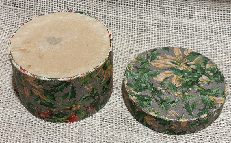 Sweet miniature wallpaper box. Poinsettia and holly wallpaper. Late 19th century, round 3 3/4" diameter, 2 3/8" high. As expected you can see how it faded with age with redness of paper inside box and portion inside top cover.