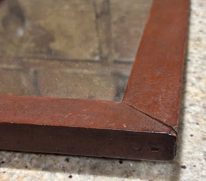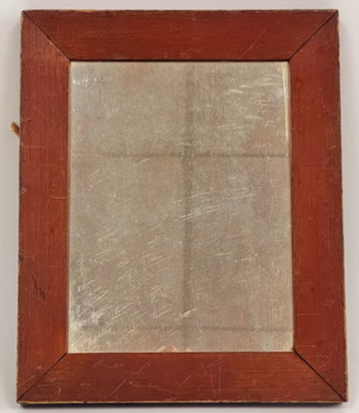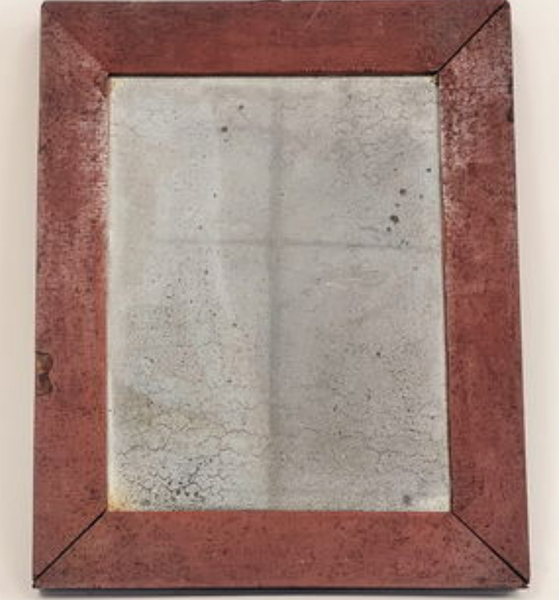 Wonderful early red painted mirror. New England, early 19th century. Dry original red paint with period glass. Measures 9” x 11.5”.