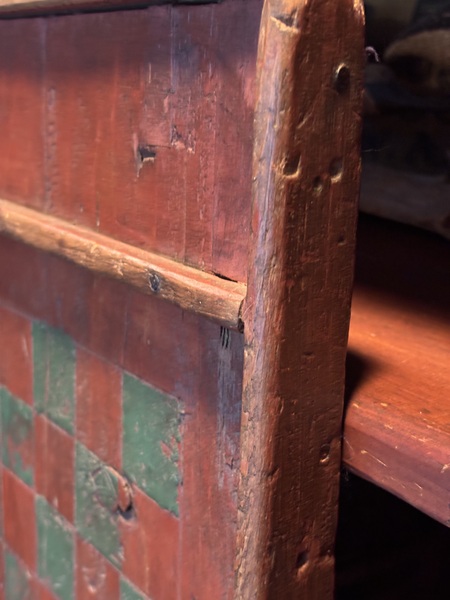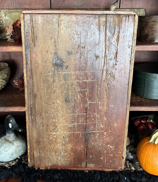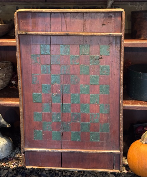 Wonderful 19th century Gameboard. Primitive rectangular painted panel, in original bittersweet and green. With incised lines, applied molding to all sides, game piece compartments at both ends. Heavy wear consistent with age and use. Early forged irregular and square nail construction. Measures 25” x 15 1/2” x 1 1/4” deep. Great piece of folk art!