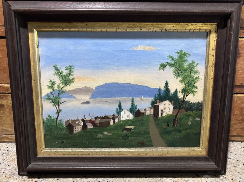 Wonderful New England Folk art painting. Oil on canvas, with great detail of lakeside townscape. Late 19th c., in overall good condition with period frame. No apparent damages or repairs. Measures, frame - 12 3/4" x 15 3/4".