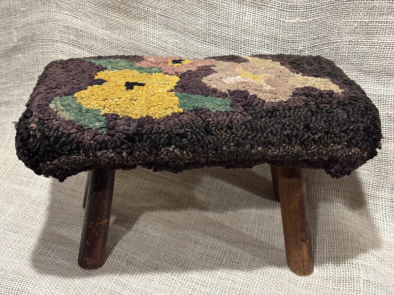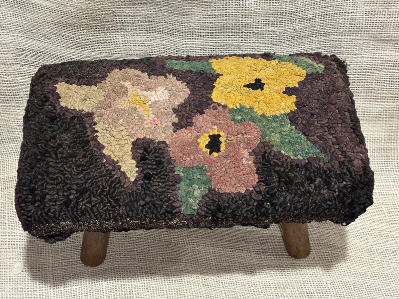 Sweet early footstool with hooked upholstered top. Primitive floral design. Measures 13" x 8 1/2", 7" high.