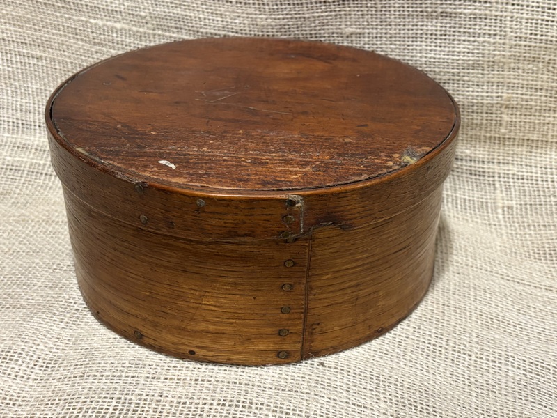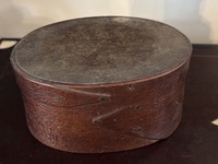 Late 19th c. oak pantry box. Minimal remnants of red wash mostly on lid. Appears someone at some point applied paste wax which left some shine on surface, also a clump on lid and filled in missing peg on lid. Copper tack and wooden peg construction. Measures 8 1/4" diameter, 3 3/4" high.