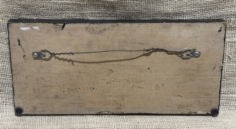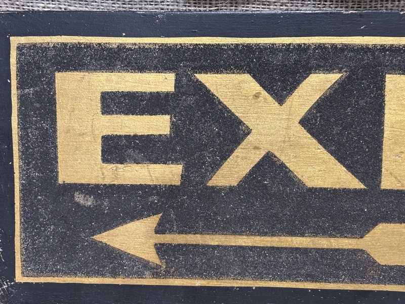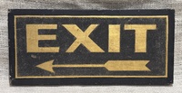 Wonderful C.1920 Exit sign. Black smaltz background and gold painted wooden sign. Fantastic bold image! Measures 13" wide, 6" high, 1" deep,