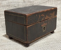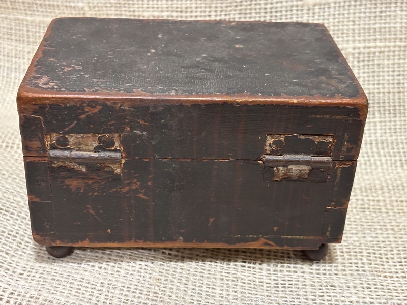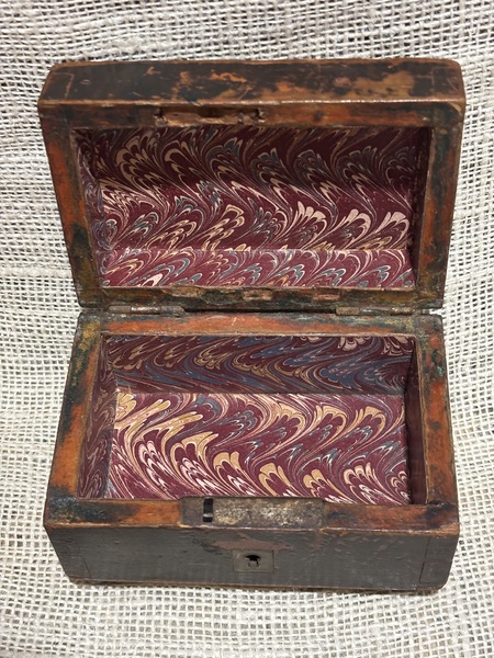 Wonderful miniature wooden box with marbled paper lining. 19th century, dovetailed with brass keyhole escutcheon and small ball feet. Original painted surface. Measures 3 1/4" x 5" x 3 1/8" high.